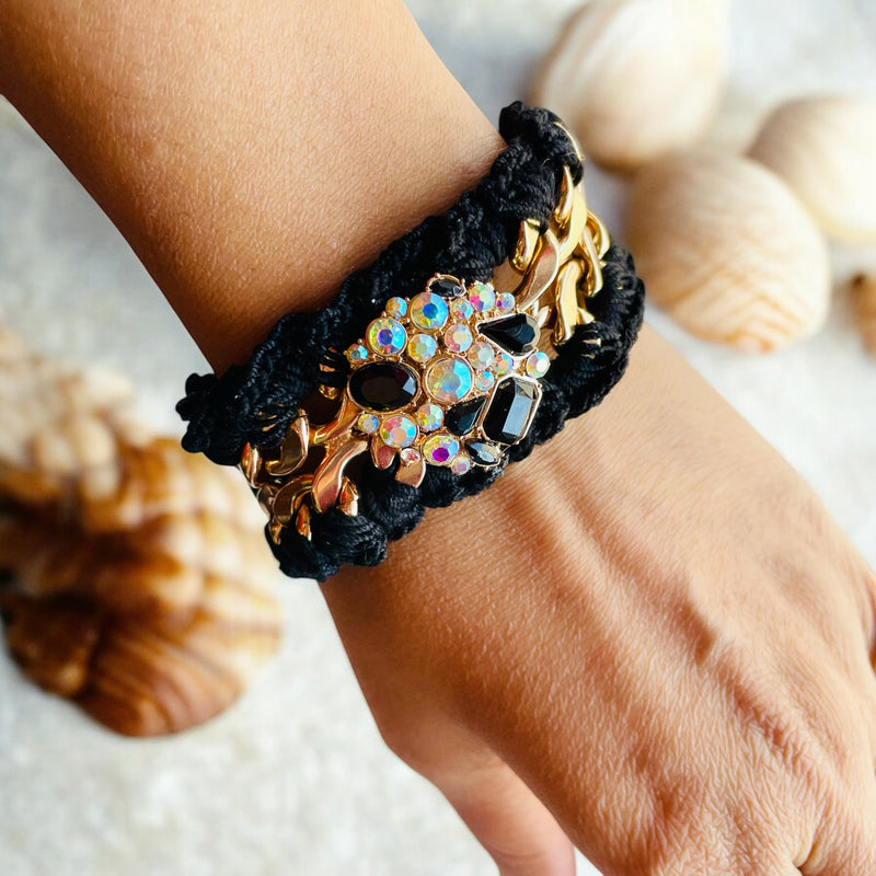 Elevate your style with our Black and Gold Crochet Cuff Bracelet, a stunning fusion of artistry and elegance. This one-of-a-kind accessory features black and gold crochet base that wraps around your wrist, exuding warmth and sophistication. The intricate crochet work adds a textured, handcrafted feel, making each bracelet a unique piece of wearable art.