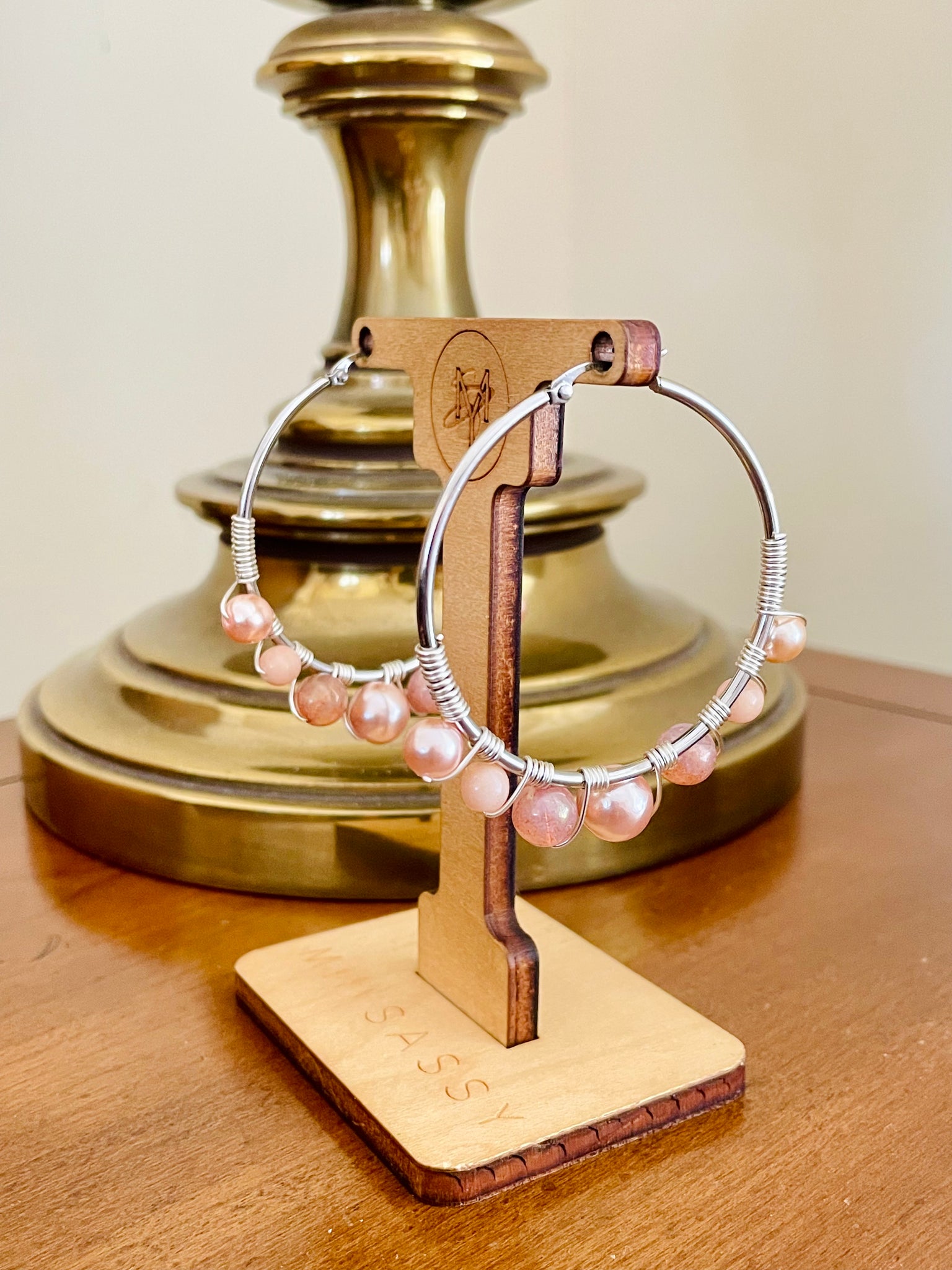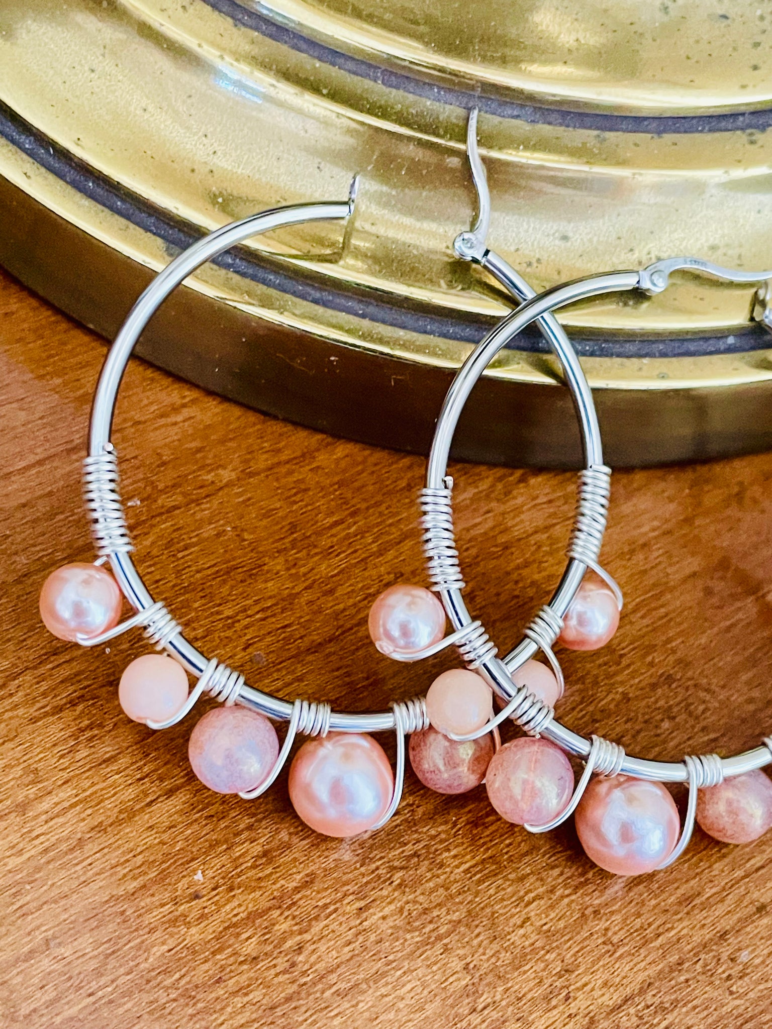 Add a touch of elegance and charm to your everyday style with these beautifully handmade hoop earrings. Each delicate bead in soft **peach and light blush pink tones** is individually wire-wrapped around a **tarnish-free stainless steel hoop**, creating a timeless design that shimmers with every turn.