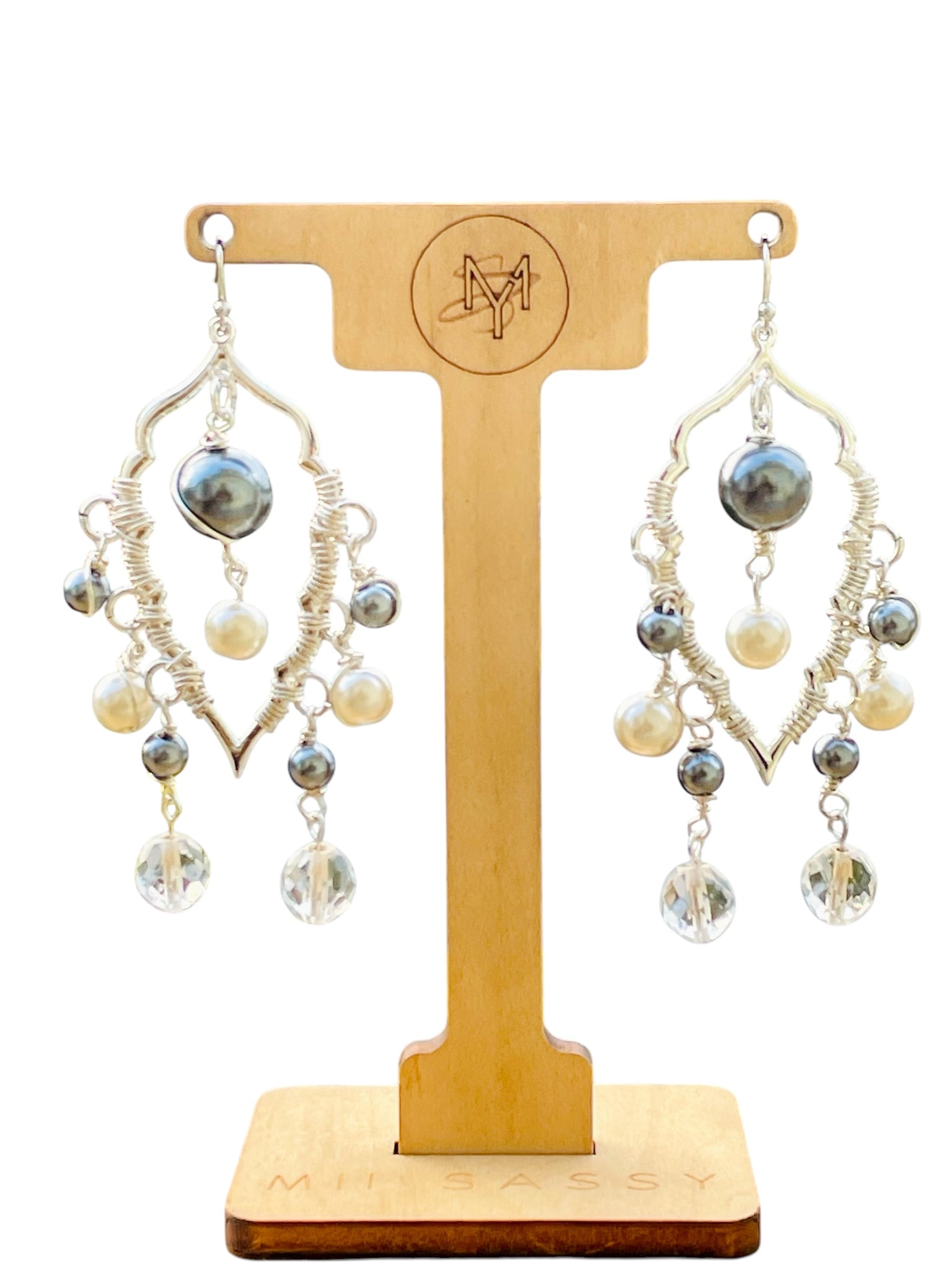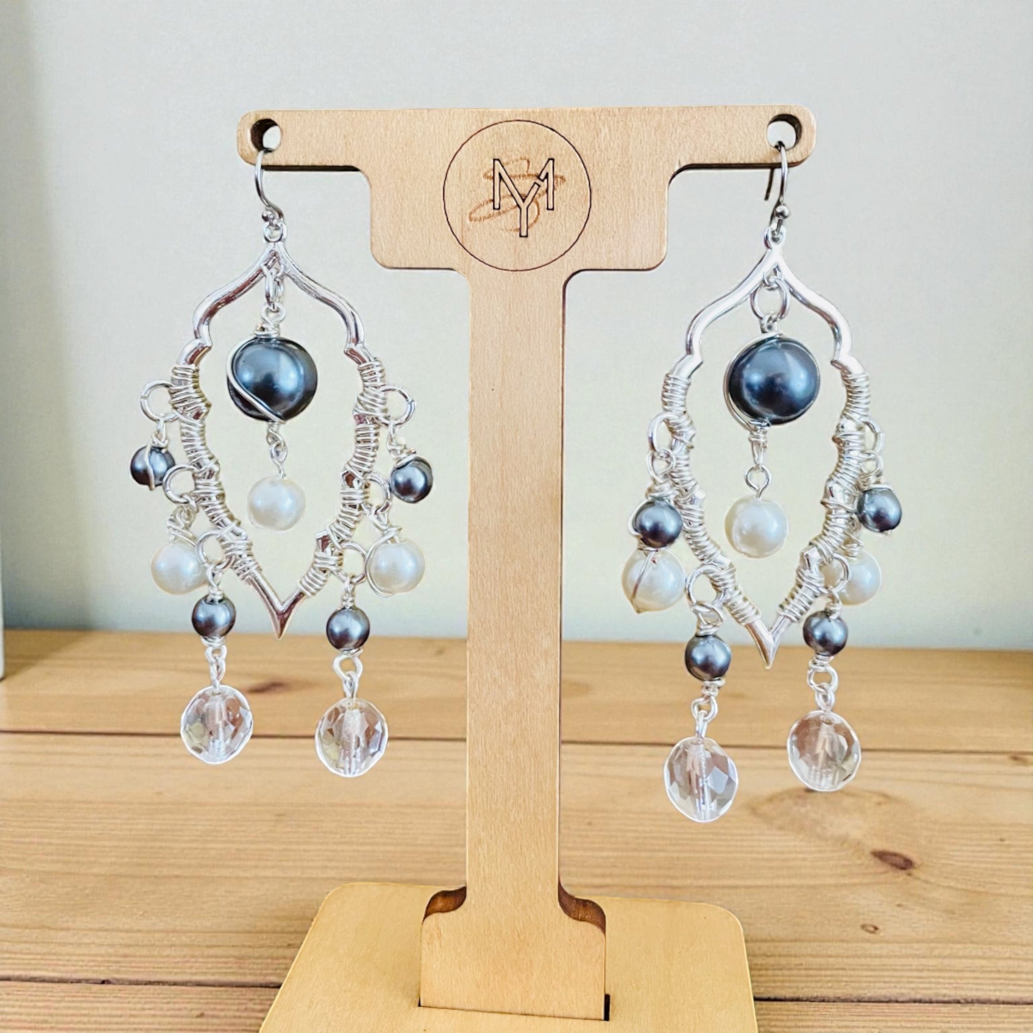 Elevate your style with these **artistic and beautifully handcrafted chandelier earrings**, featuring a harmonious blend of **gray and white pearl glass beads**. Each bead is expertly wire-wrapped** onto elegant **cut-out drop components**, creating a graceful design that moves effortlessly with every turn.