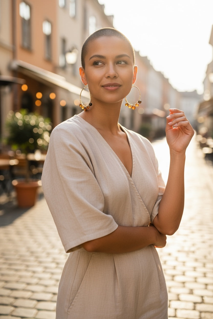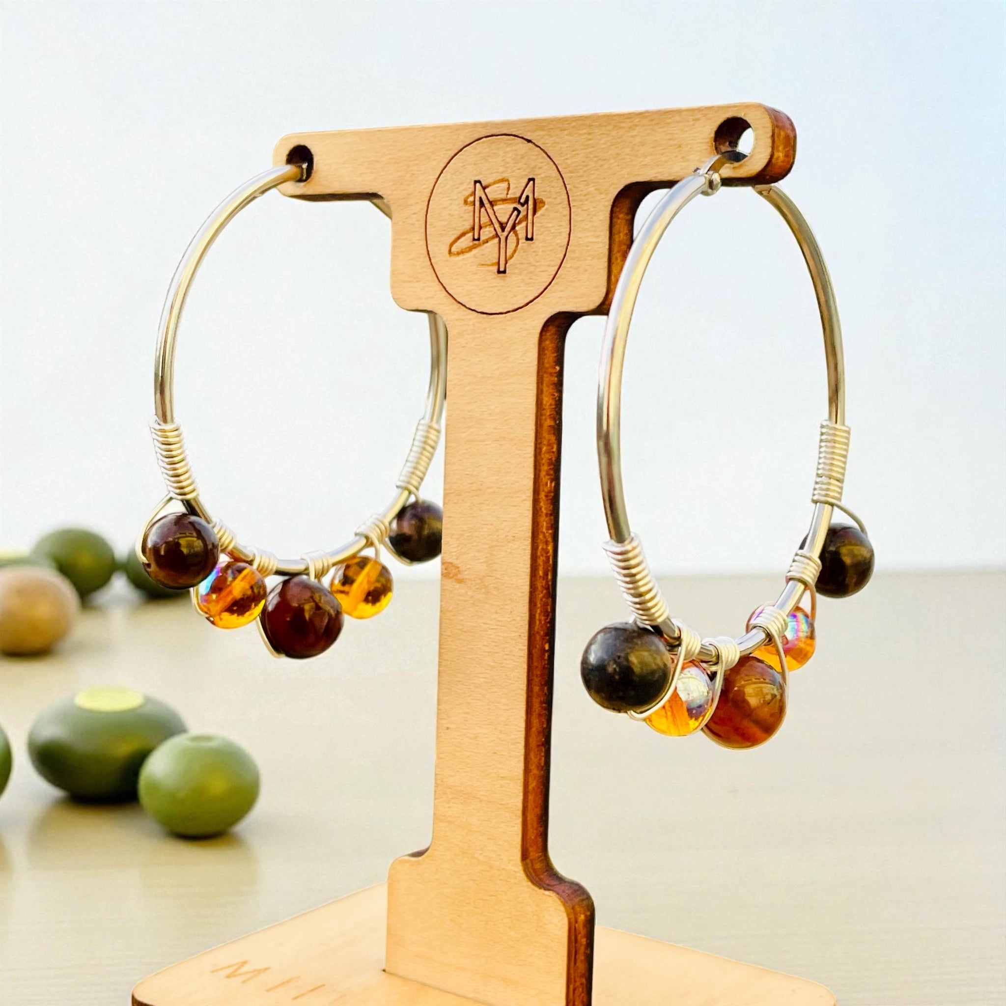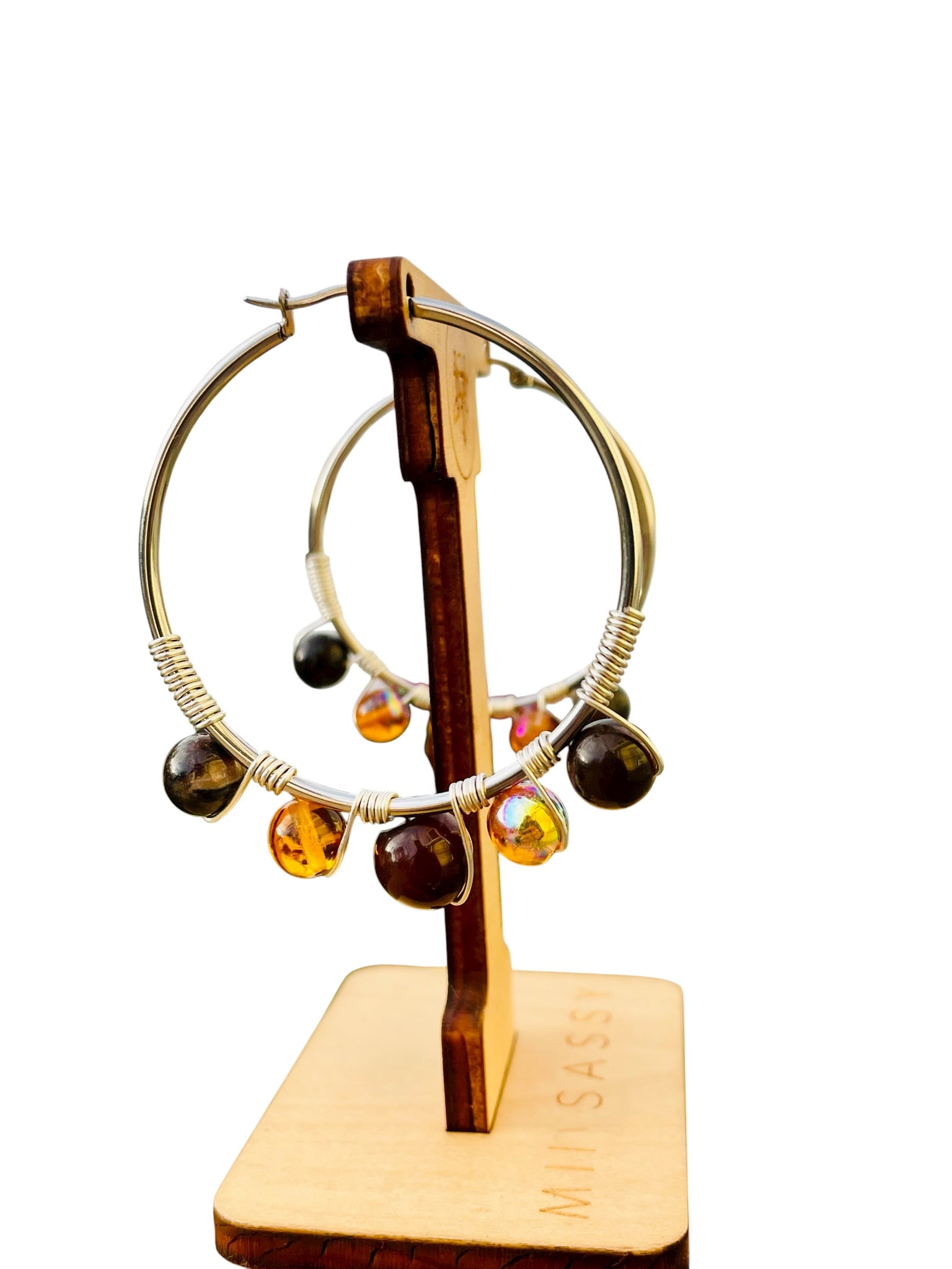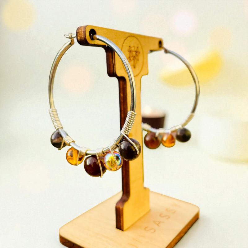 Add natural warmth and handcrafted charm to your jewelry collection with these **Semi-Precious Brown and Glass Amber Beaded Wire-Wrapped Hoop Earrings**. Each bead is **carefully hand-wrapped** onto a **tarnish-free stainless steel hoop**, combining the rich, earthy tones of semi-precious brown stones with the luminous glow of amber glass beads.
