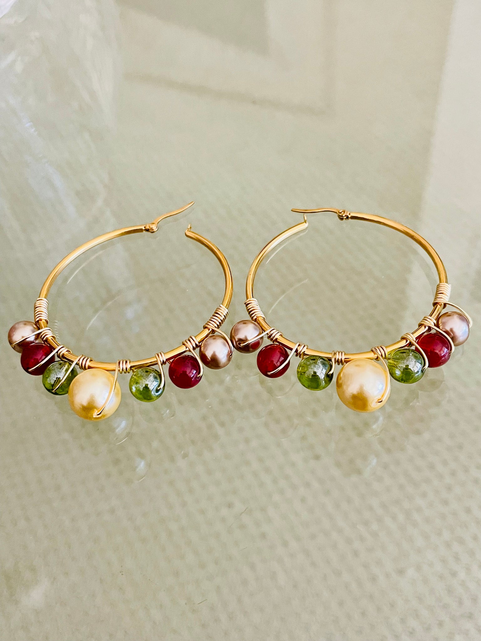 Shine bright with these one-of-a-kind wire-wrapped hoops — where timeless craftsmanship meets vibrant color and golden elegance.