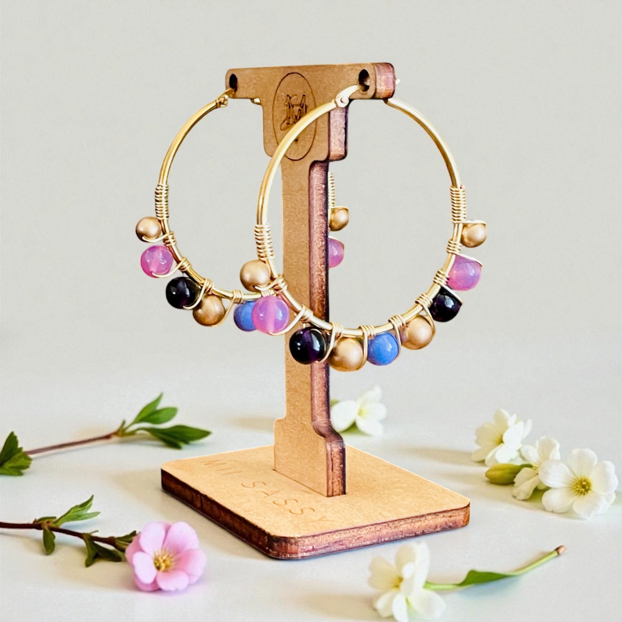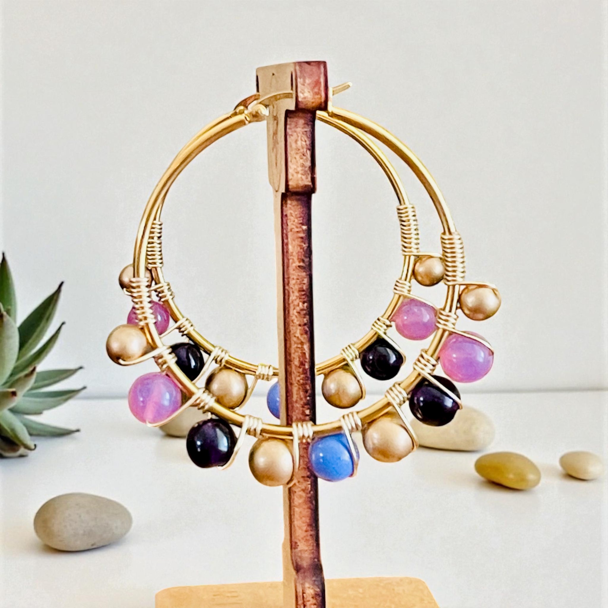 Elevate your everyday style with these stunning handcrafted hoops. Featuring a vibrant blend of purple and multicolored glass beads, each pair is beautifully wire-wrapped around premium gold hoops for a look that’s both bold and elegant.