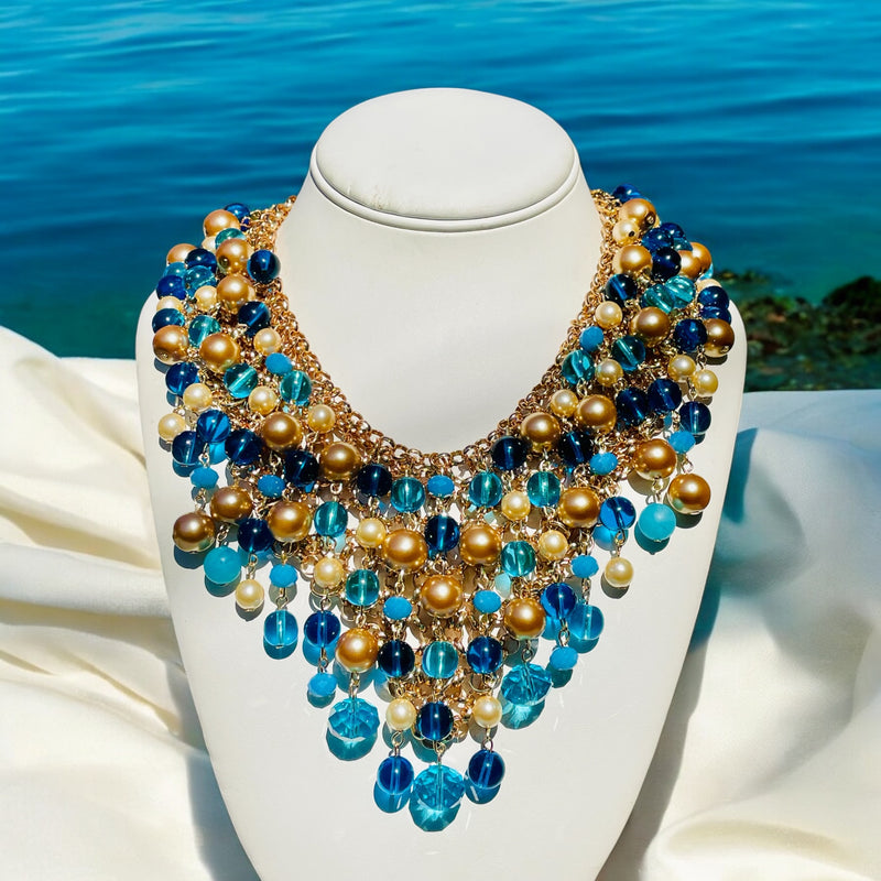 Introducing our striking bib-style necklace—a true masterpiece designed for those who dare to make a statement. This bold accessory features an artful combination of blue glass beads, and gold glass beads, each meticulously linked to create a captivating visual symphony.